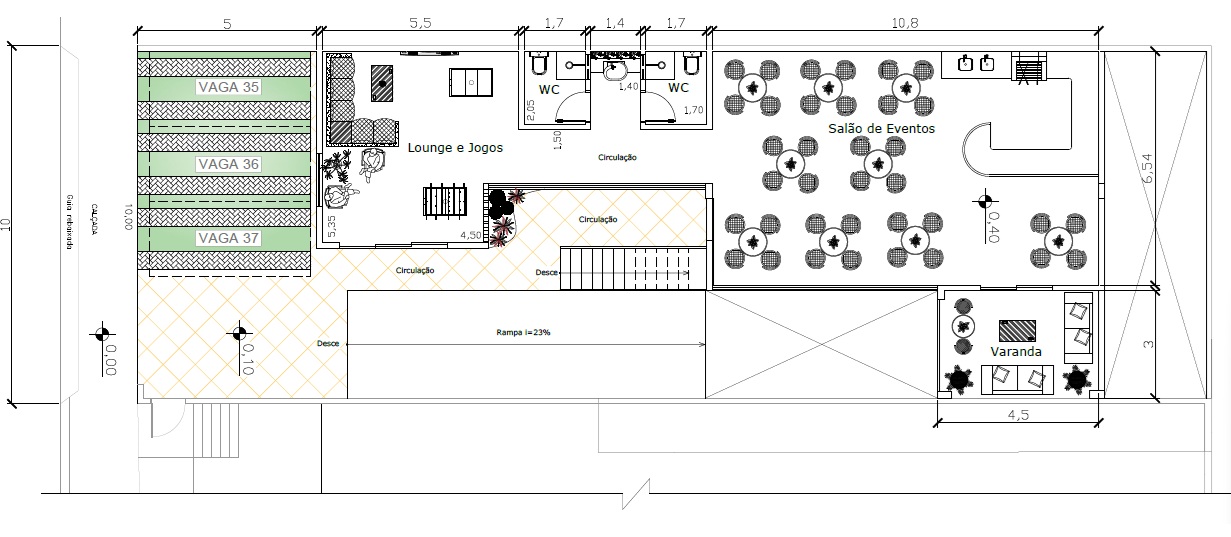 Um lote com 300m² (10x30) de área, em declive favoreceu o estudo deste projeto.