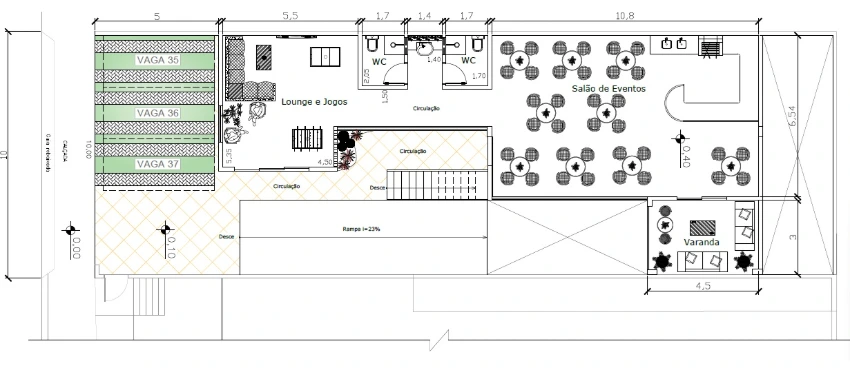 O interior foi pensado para atender a todas as necessidades do colaborador. Teremos um amplo salão de festas equipado com churrasqueira, bancada com pia e mesas, ideal para as confraternizações. Mas também pensamos no dia a dia: o espaço contará com uma sala de descanso silenciosa e dois banheiros completos com chuveiros, oferecendo conforto total para quem precisa relaxar ou se arrumar após o trabalho.