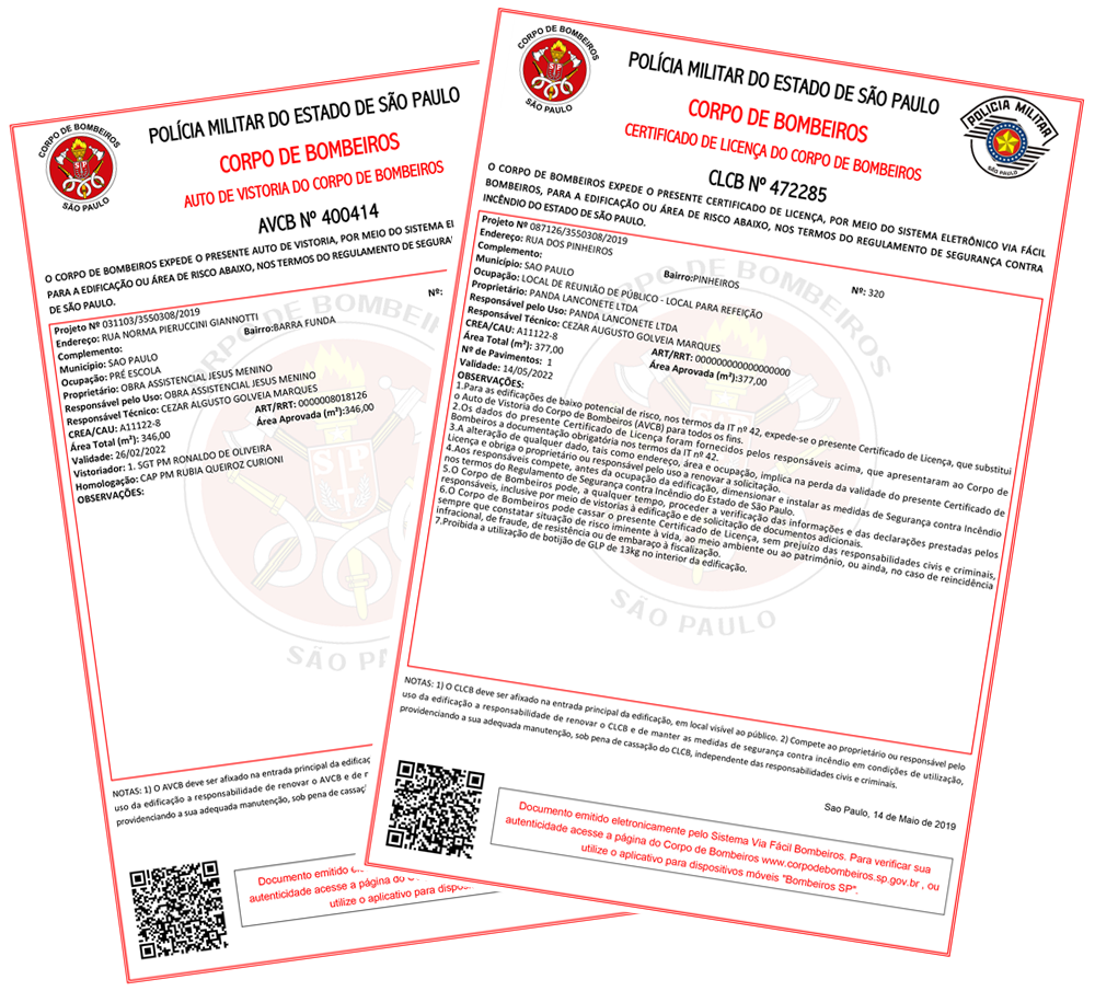 - AVCB: Para maior risco, processo mais complexo, com vistoria prévia, para edificações maiores e mais complexas.